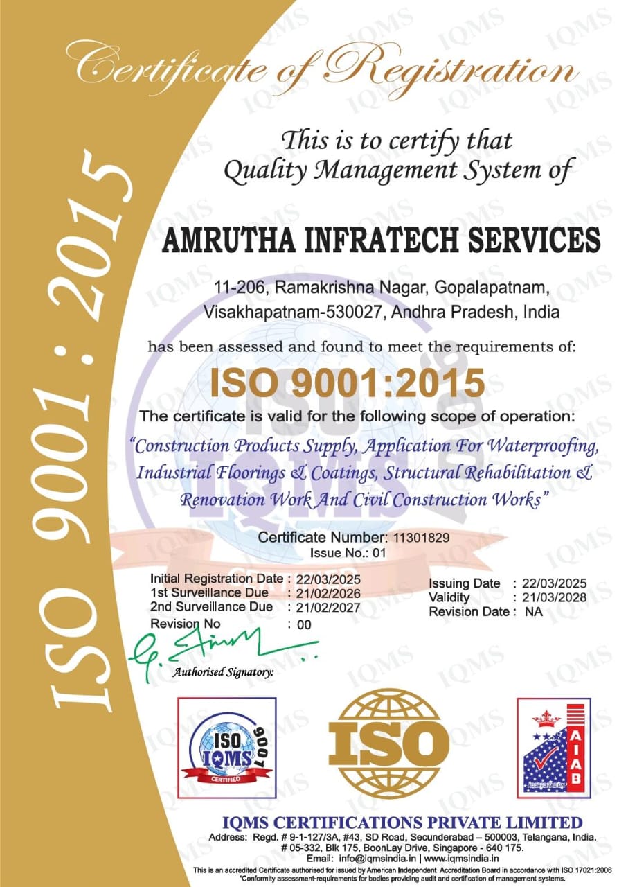 M/s Amrutha Infratech service is a provider of end to end constructions material & Building Restoration services and solutions to help clients to improve safety and longevity of structures. We have been relentlessly working on providing services and solutions in the area of concrete repairs, all type of waterproofing works and industrial painting and Flooring & Special grouts system works.